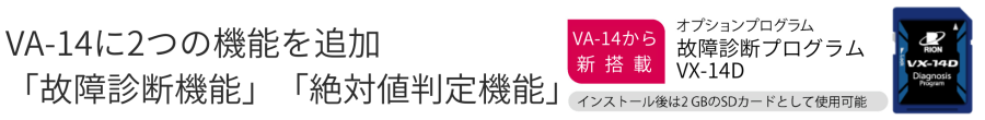 VA-14は、設備診断や現場測定に必要な機能を包括的に搭載した、FFT分析機能付きの振動分析計です。 従来機種VA-12から約200 g軽量化しスリムな形状となり、片手で持ちやすく現場測定に最適です。 新たにLAN端子を搭載したことで、通信機器との接続が強化され、遠隔で本器のコマンド制御やファイル転送が可能です。 また、機能拡張プログラム VX-14Sをインストールすることで、マイクロホンを接続し音を測ることが可能となり、振動測定に加え、音の周波数分析・評価までVA-14 1台でカバーします。 機械設備やモーターなどの回転体が発する振動の測定や、振動による設備診断に加え、製品の研究開発など、様々な測定場面でご利用いただけます。 また、故障診断プログラム VX-14Dをインストールすることで「故障診断機能」が追加され、ベアリング異常などの摩耗系故障やアンバランス・ミスアライメントなどの構造系故障の診断を行うことが可能となります。 さらに「絶対値判定機能」が追加され、設備の健全性を判断するために、ISO 10816-1に基づく判定基準値、またはISO 20816シリーズに基づく任意の判定閾値を設定できるようになりました。 これにより、設備診断をより簡便かつ高精度に実施することが可能となります。