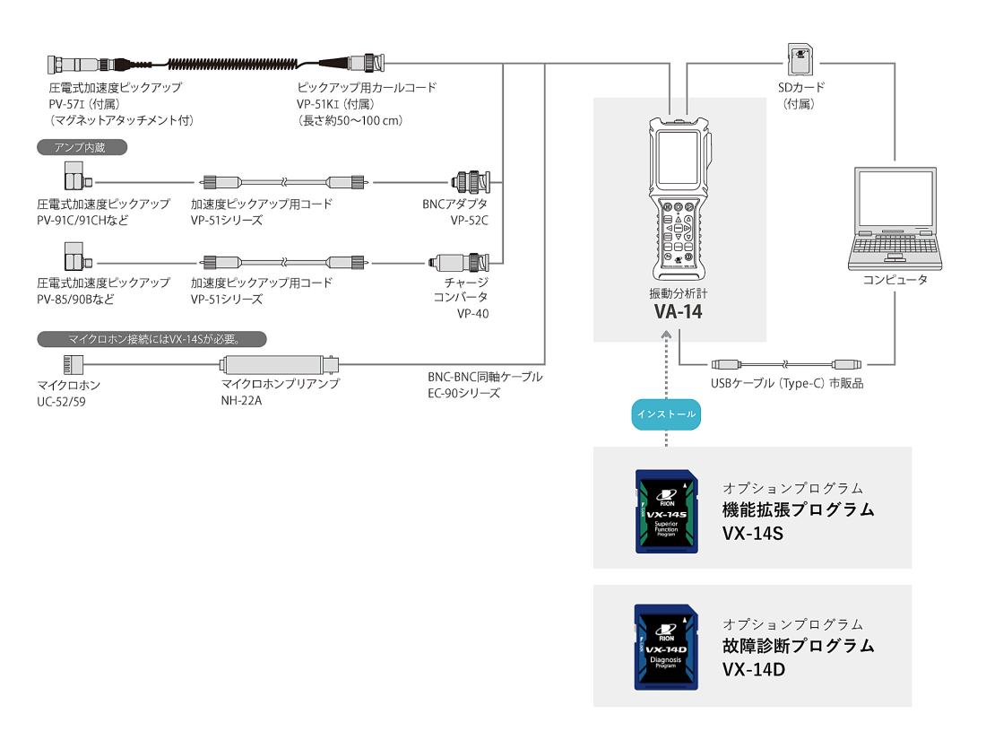 マイクロホンを接続し音の測定が可能。振動測定に加え、音の評価までVA-14 1台でカバー。 ※VX-14Sが必要