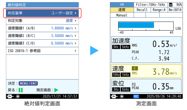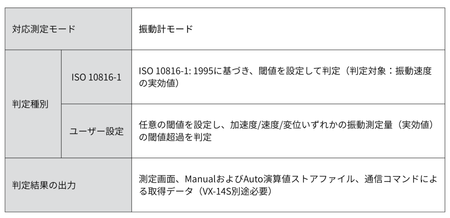 ・ 加速度、速度、変位のいずれかを選択し、利用者が指定する任意の閾値を設定して判定することが可能