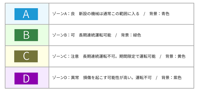・ ISO 10816-1で規定された、振動評価ゾーン(A:良、B:可、C:注意、D:異常)の判定基準値に基づき判定