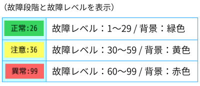 ● 故障レベルを1~99の数値で評価し、レベルに応じた3つの故障段階(正常、注意、異常)を表示および保存