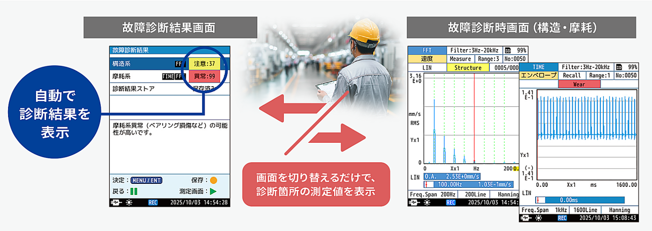 自動診断結果だけでなく、測定データ(FFT分析結果、振幅波形データ)も確認できるため、