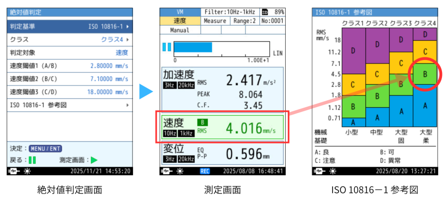 ”ISO 10816-1に基づく基準値 ” が閾値として自動設定されるため、複雑な操作無しで判定を行うことが可能